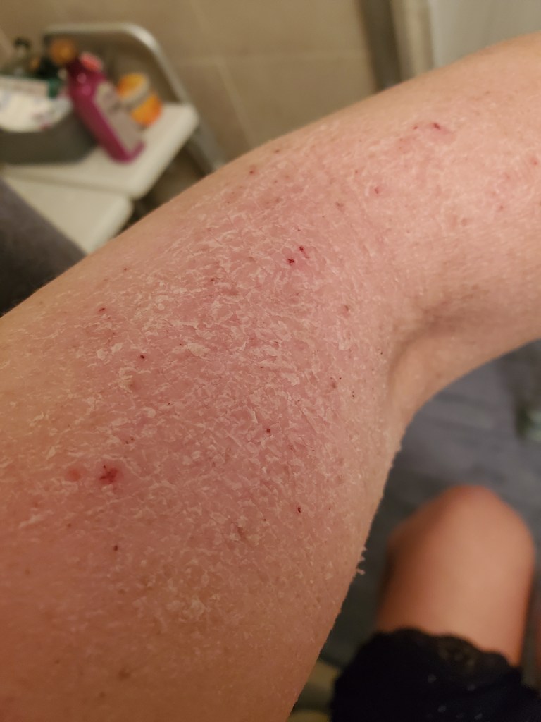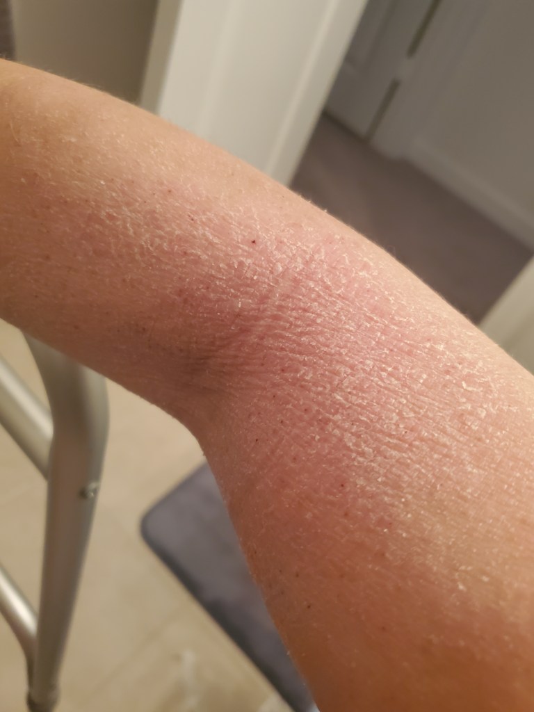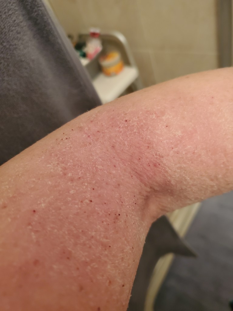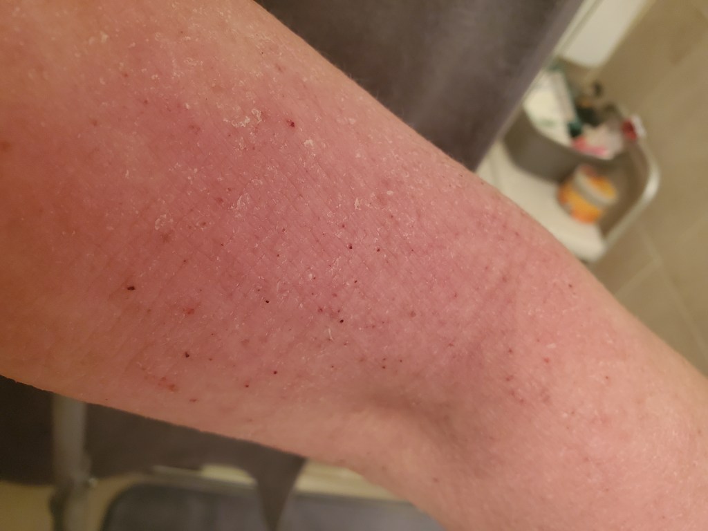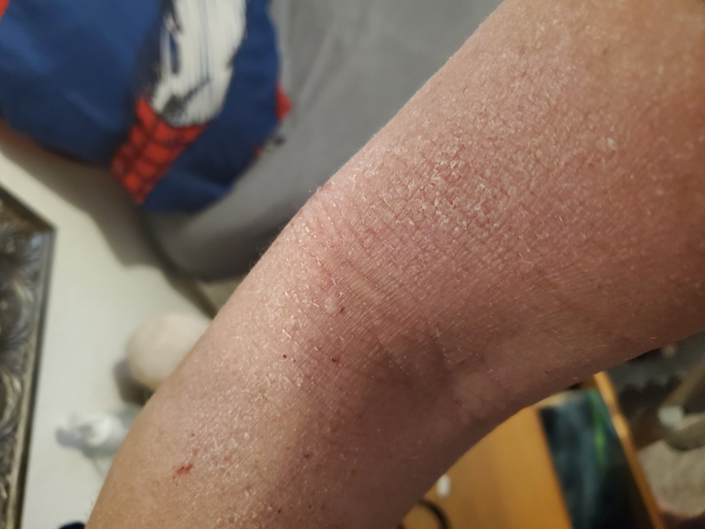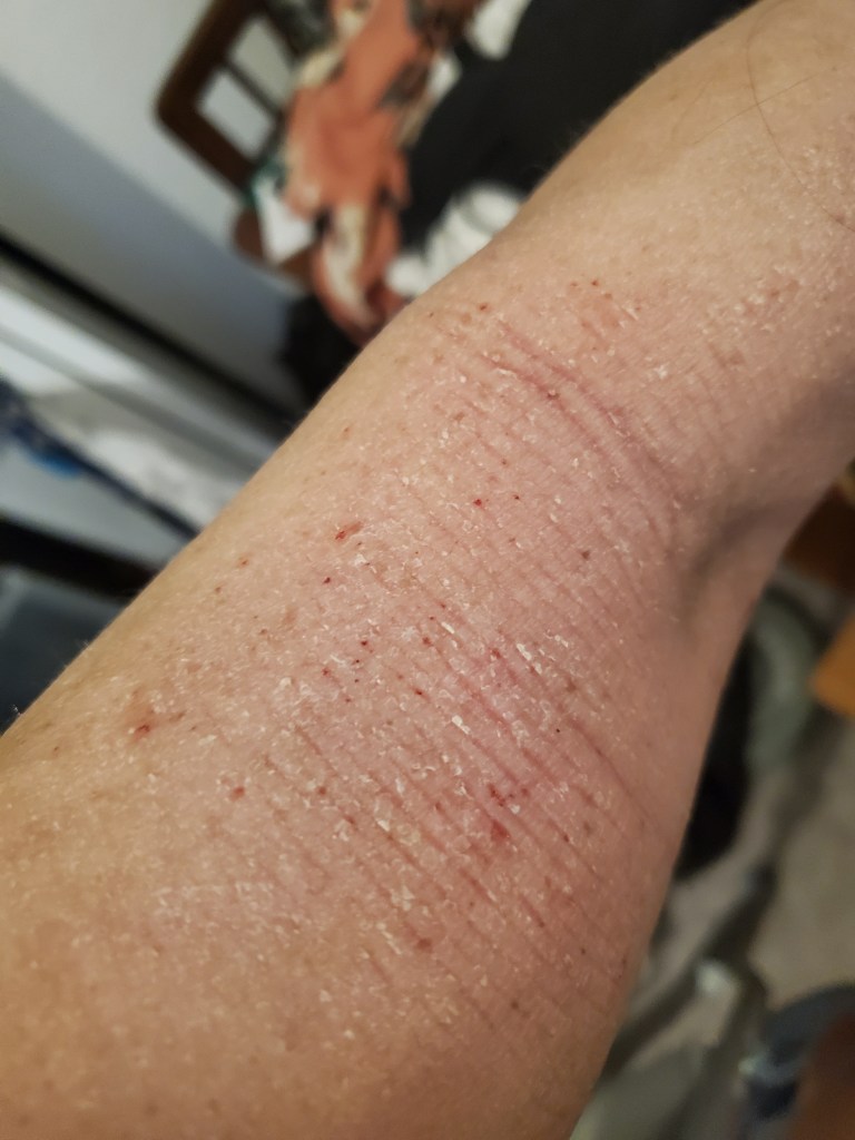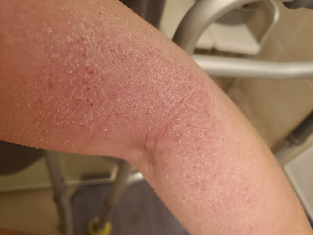 My skin was already in a mini flare beforehand, most likely due to stress, but now it is the worst it has been in a very long time. I have oozing, my skin smells, super flaking, tons of fatigue, and an itch that is relentless. My red sleeve is almost in full swing.