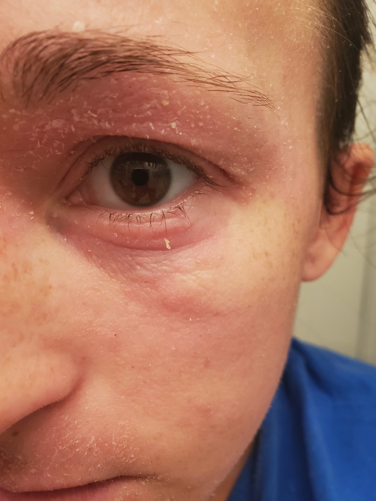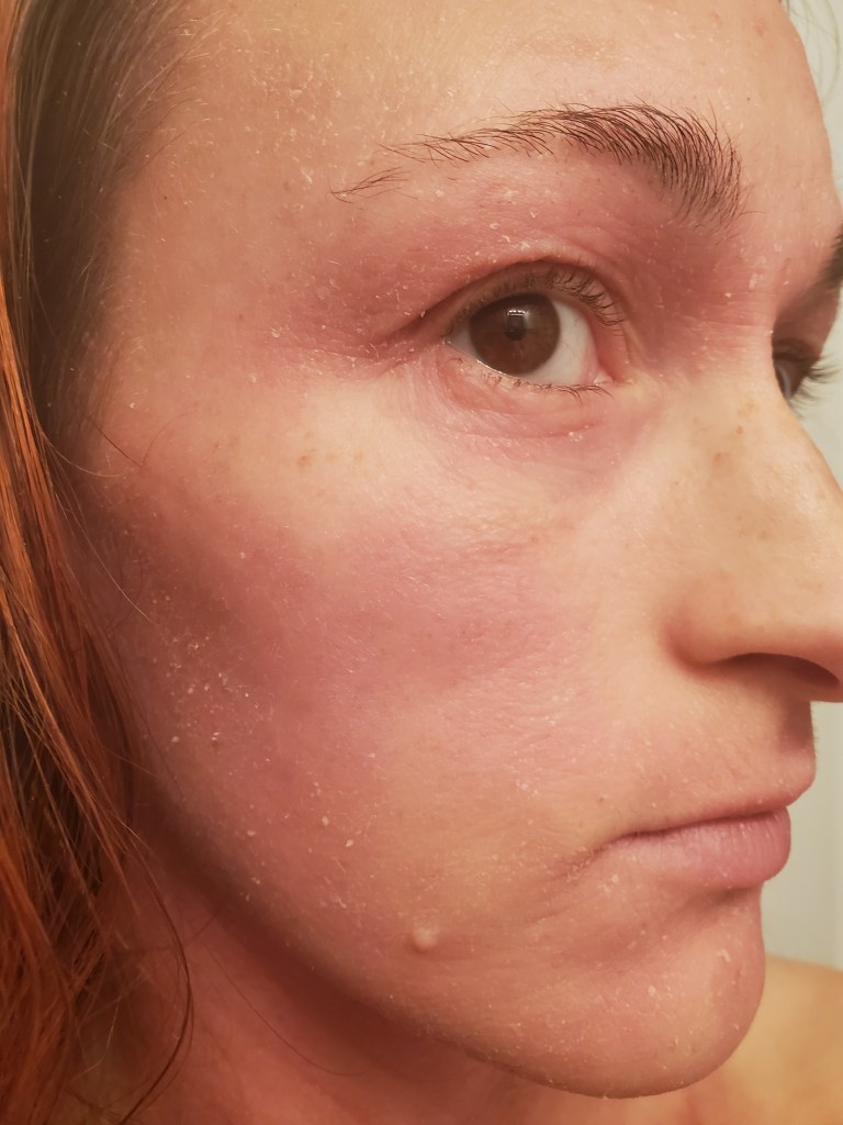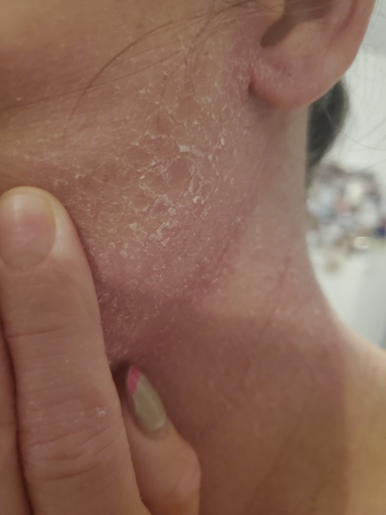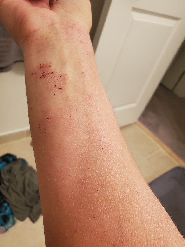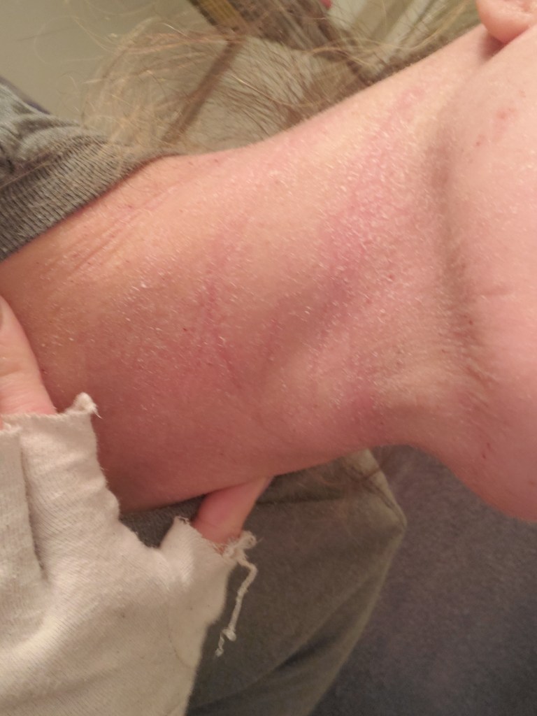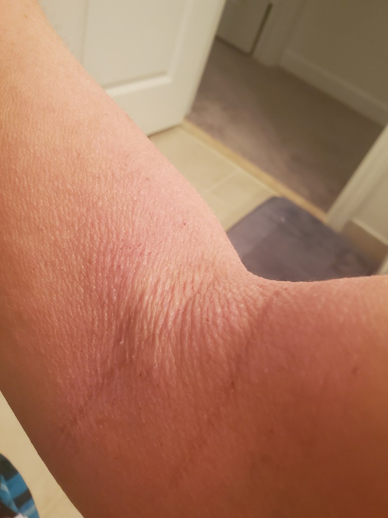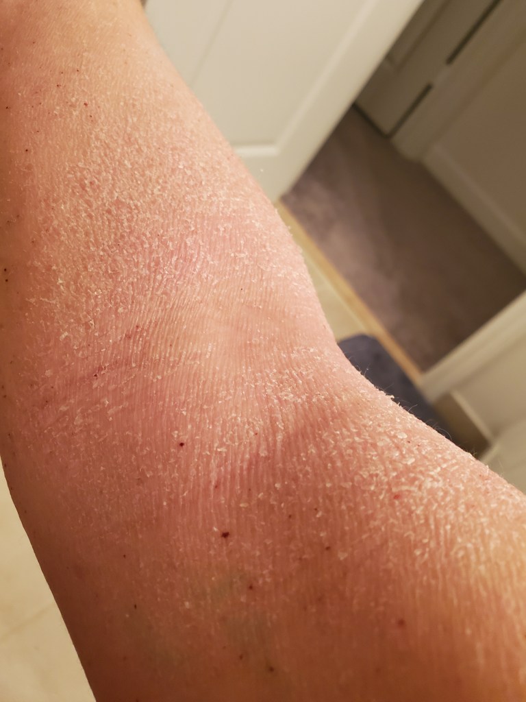 My skin was already in a mini flare beforehand, most likely due to stress, but now it is the worst it has been in a very long time. I have oozing, my skin smells, super flaking, tons of fatigue, and an itch that is relentless. My red sleeve is almost in full swing.